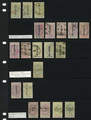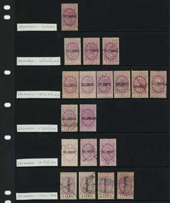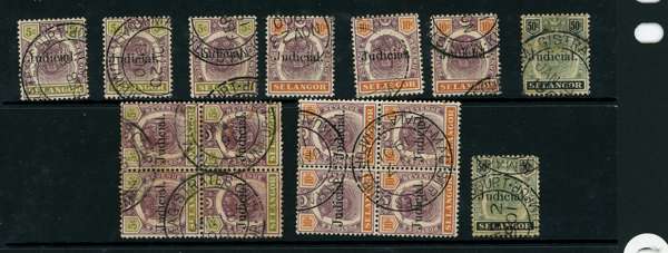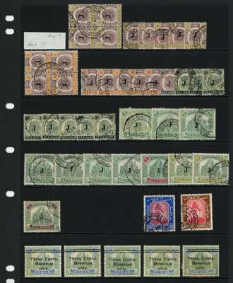 Used collection (c.200) displayed on stock sheets, including Judicial 'J' overprints on Tiger and Elephant issues in black green and blue with values to $25, 1900-02 'Judicial.' opts to $5, extensive range of 'Selangor' opts on Straits revenue types with values to $5, sorted by type, 1950 $25 and $100 used and 1890 Sungei Ujong opts on Malaya revenues (4) to $5. An interesting lot which would take years to replicate.