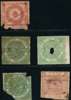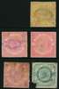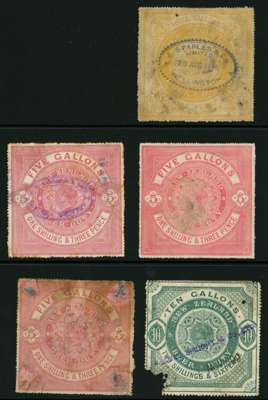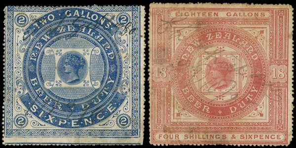 Beer Duty: 1883 Second issue collection of 14 used examples comprising 6d blue, 9d yellow, 1s3d rose (3), 2s6d green, 4s6d red (2), 9s green (3), and 13s orange-brown (3). Usual very mixed condition for these large format stamps which were applied over the bung of a beer barrel, still an interesting lot for further research with various watermarks and perforations to study. Kiwi R27/38