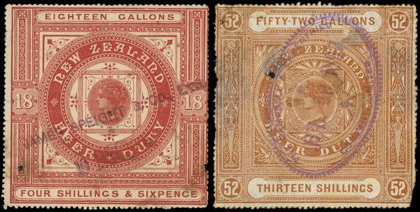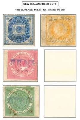 Beer Duty: 1883 Second Issue 6d blue, 9d yellow, 1s3d red, 4s6d maroon, 9s yellow green and 13s orange-brown, each with usual blemishes (pin holes and some creasing), still way above average for these delicate large format stamps and the majority with fine dated cancellations. Kiwi R27/38
