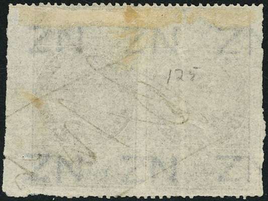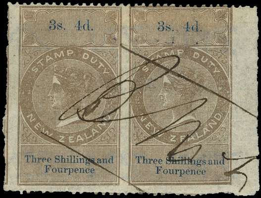 1867 Wmk NZ 3s4d blue Perf 12½, horizontal pair, error IMPERFORATE VERTICALLY, cancelled in ms with large margins both left and right. Perfs a little ragged at foot, otherwise fine. A very rare error, unlisted in the Kiwi catalogue.