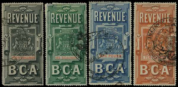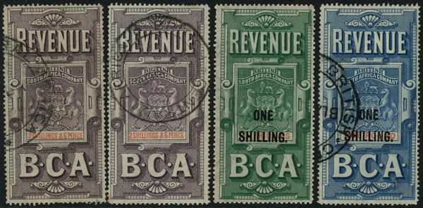 Revenue: 1891 Large format 2s6d to £10 complete set of five (with additional 2s6d) and 1893 1s on 10s mint, and 1s on £1 used, the key £10 cancelled with 'BLANTYRE' consular hs. A few peripheral imperfections and short perforations as are almost always found on these large format stamps (including £10 with small tear in upper margin) still a highly desirable set, the £10 most elusive.