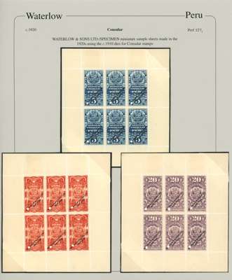 Consular: 1893 set of seven Waterlow MASTER DIES in black, finished designs as issued each with die numbers and ms annotations above each impression, offered with complete set of plate proofs in the issued colours, and the complete set of Printer's sample sheets for the issue, 2.50 printer's sample in green and 50p as issued on piece. A unique group, ex Clive Akerman and offered on his original exhibition page.