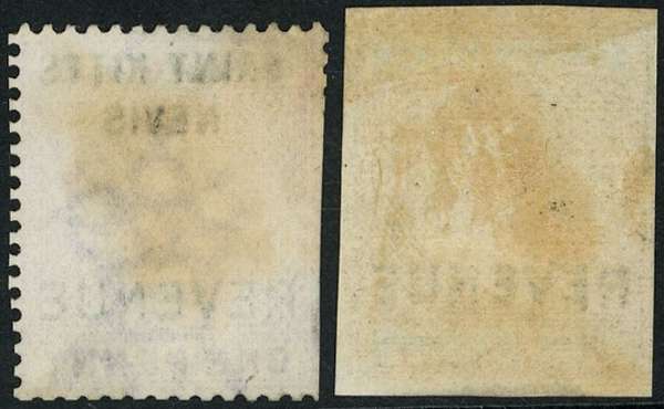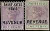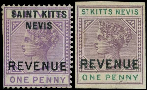 1885 Pair of QV small format key type essays for unissued St Kitts Nevis Revenue stamps, proposed by De La Rue to the Colony on 4 August 1884 the first Nevis 1d mauve wmk CC, opt 'SAINT KITTS/NEVIS/ REVENUE' in the same alignment as issued but in larger block font, the second imperforate and without wmk 1d mauve with value tablets HAND PAINTED in Chinese white and green to read 'St KITTS NEVIS/ ONE PENNY'. The former with clipped perfs at left, though still a fascinating pair of essays, ideal for an exhibit.