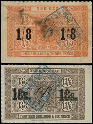 Beer Duty: 1900-01 pair of used manuscript surcharges comprising manuscript 1/3 (corrected from 2/3), on 1s8d on 1s3d orange, and manuscript 12s6d on 18s on 13s6d brown, the latter of the two unlisted by Elsmore and unrecorded.