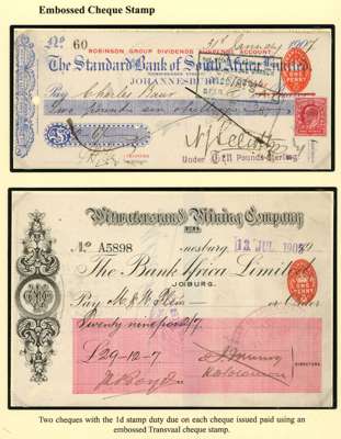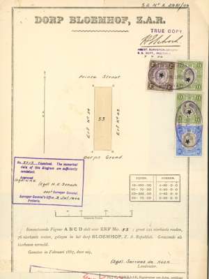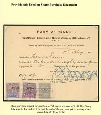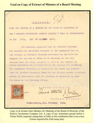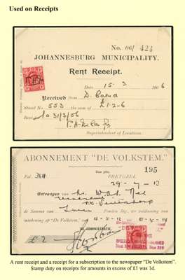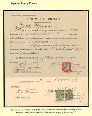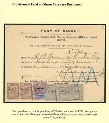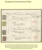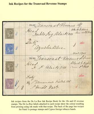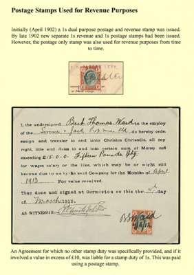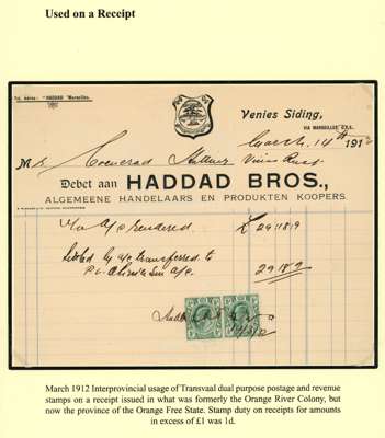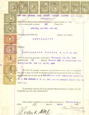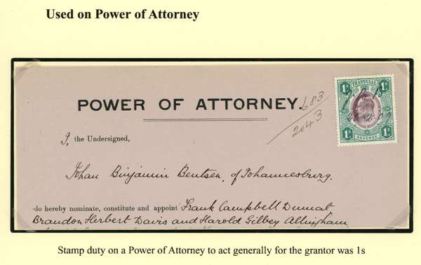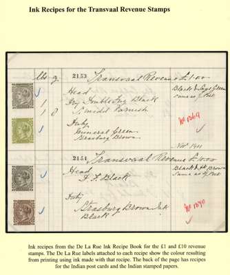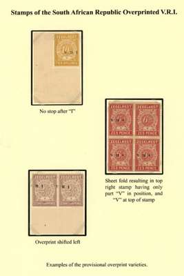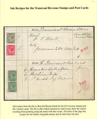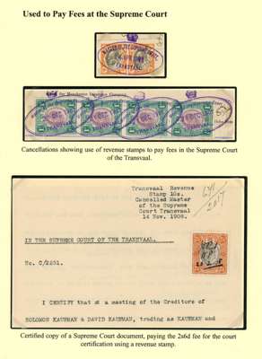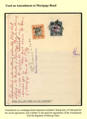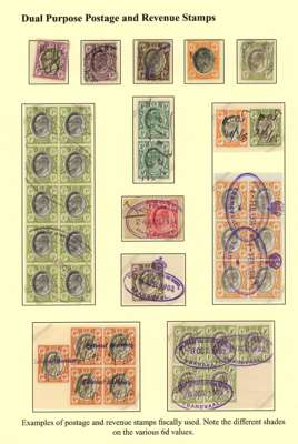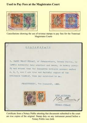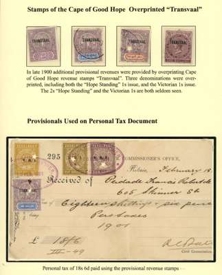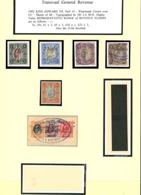 1900-06 Collection on the original Exhibition pages (25) ex Brian Trotter comprising 1900 Overprints on 'Cape Standing' Revenues (3) plus 1s purple-brown, 'V.R.I' overprints including varieties, shifts etc. A remarkable group of FIVE documents showing combination usage of Cape Standing and V.R.I. issues, ink recipes (6) for the 1906 issue bearing Dummy Stamps of the issued colours, used values to £10, (including 2s6d head inverted), usages on various documents and pieces. A beautifully written up lot with impeccable provenance.