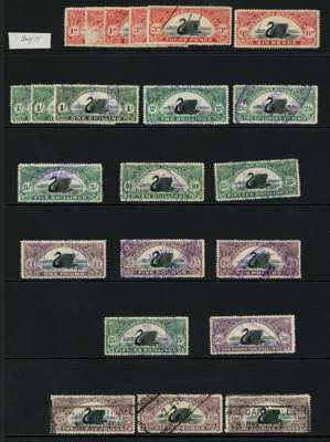 1904-66 specialised collection of Swan issues on Stock sheets, comprising 1904 Waterlow complete set including the rare £50 and £100 values and a study of perforation and watermark varieties, government and zinc plate printings including most high values, direct impressed duty stamps (6) to £10, and pages of 1941 onwards small format issues sorted by printing and set. A very fine lot showing an impressive level of completion.