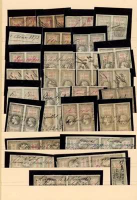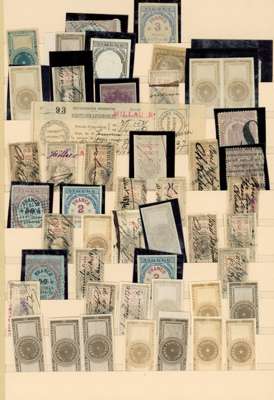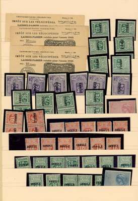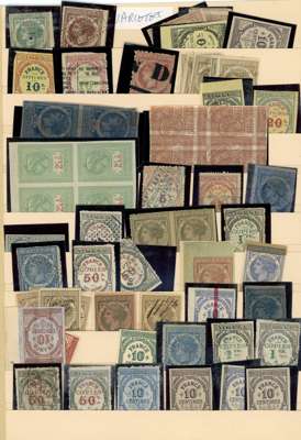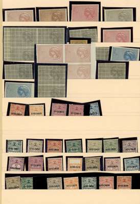 PROOFS, SPECIMENS AND VARIETIES: Exceptional collection (100's) on stock sheets, including private perforation varieties, multiples, imperforate blocks, Specimen overprints, varieties and essays including DIMENSON 1862 essays on burelage paper, (2) 1865 essays on coloured paper and rouletted, EFFETS DE COMMERCE frame proofs without value, MEDALLION key type proofs without value, imperforate and with varieties. ROLES D'EQUIPAGES imperforate proof in blue etc. etc. An mazing and completely intact treasure trove containing some remarkably rare material.