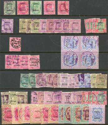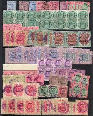 Postal Service Revenue: Comprehensive revenue collection on 3 stocksheets, the first card mint and including first issues and values to 5r, then a comprehensive range to KEVII including used multiples etc. A lovely group, this trype of revenue rarely offered in this quantity.