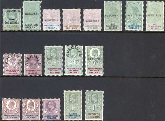 QV/KE VII balance group with Specimens: 1903 Dog Licence on 6d Petty Sessions, fine o.g.; Judicature 1888 1s on blued paper, o.g. with missing corner, Type GB14 inverted; Land Commission 1881 2d to 5s less 2s6d, some faults; Registration of Title 1902 3d and 6d - 5s, mixed Types GB 16 and 17, 1s one short perf otherwise fine o.g. Also issued stamps, part o.g.; Land Commission 1902 2d, 3d, 6d and 1s, and Records 1s