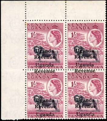 Uganda Revenue 1954 1s mint block, variety OVERPRINT DOUBLE