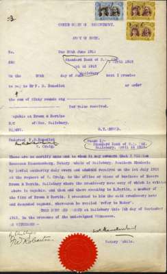 Revenues. 1912 document with vertical pair of 5d purple-brown and ochre (SG 141ab) and 2/- (SG 154), manuscript cancels. 5ds on document are rare