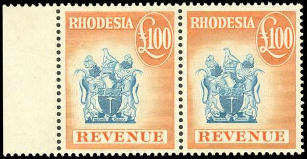 Revenue. 1966 £100 orange and blue horizontal pair, marginal at left, unmounted o.g. Light toned spots on the reverse, not affecting fine appearance. Ex ‘Blanic’. Barefoot 50