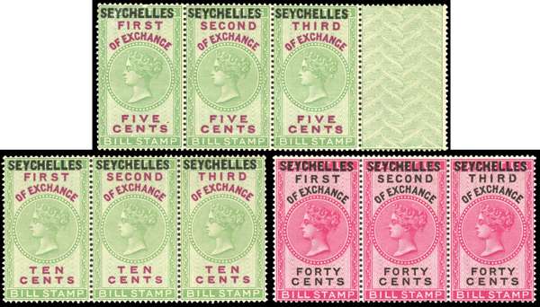 Bill of Exchange. 1896 5c, 10c and 40c First, Second and Third of Exchange mint strips of three, unmounted o.g. The 10c strip with a couple of creases, still of fine appearance; the 5c strip with interpanneau margin at right, showing a zigzag pattern. McClellan B1, 2 and 4