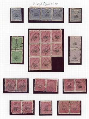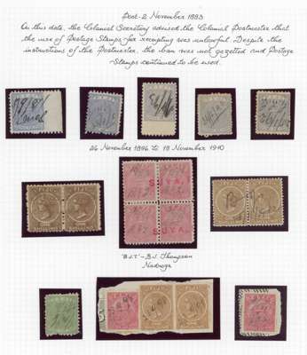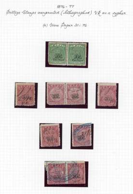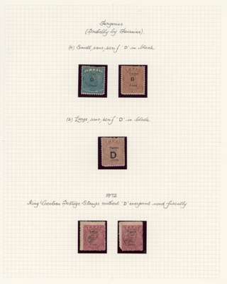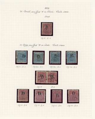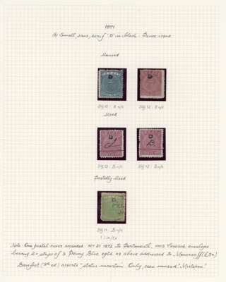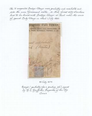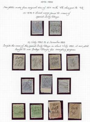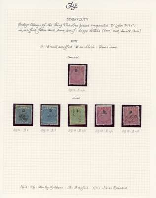 1871-1903 QV collection beautifully written up on album pages, comprising 1871 overprint small seriffed ‘D’ in black 6d carmine-rose unused, and 1d blue (2), 3d pale yellow-green and 6d carmine-rose used (2), overprint sans-serif ‘D’ in black, unused 1d blue and 6d carmine-rose, with used 6d carmine-rose (2) and 3d pale yellow-green with apparent postal cancellation, large seriffed ‘D’ in black 1d pale blue (4) and 6d carmine-rose (6), Fournier forgeries (3), and Fiscal use of postage stamps, an extensive collection (72) written up by issue including receipt usage at ‘FIJI TIMES’ signed by proprietor. A wonderful lot, ex Medlicott and offered on his original pages.