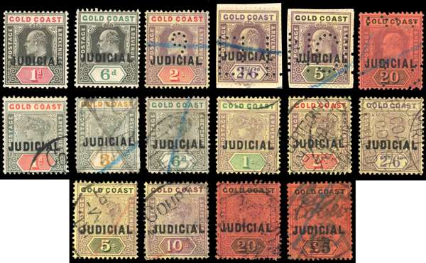Judicial Revenue. 1899 1d to £5 complete set, offered with KEVII 1d to 20s group of 6 values. A few heavily cancelled but still a fine lot, the £5 a major rarity and a denomination which was not issued as a postage stamp. [N.B. the supposed paper varieties listed by Barefoot do not exist]