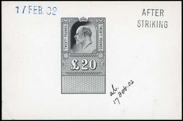 Unappropriated Dies. KEVII £20 Die Proof on glazed white card, 92 x 61mm. Marked BEFORE HARDENING and dated 17 FEB 02 in blue, the same date in ink at lower right with initials ‘a.l.’