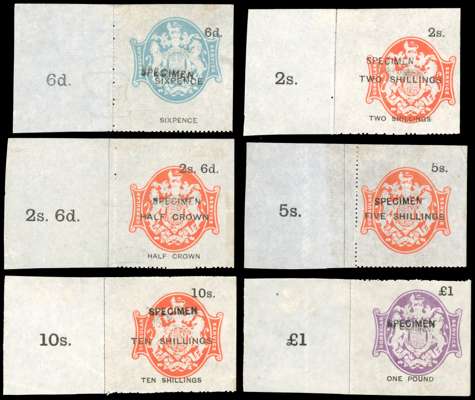 Consular Service. 1885 group of six (no 1s) with counterfoils, o.g. (except on the counterfoils), each handstamped SPECIMEN 18 x 3mm. The 6d, 2s, 2s6d and 10s with values across stamp and at base; the 5s across centre only, and the £1 at base only. A fine group