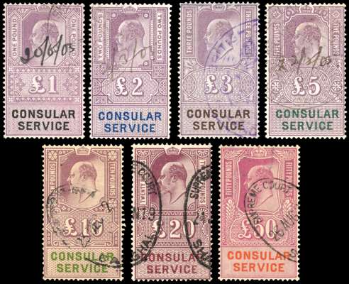 GB Consular Service 1902 £1 to £20 and 1915 £50 used