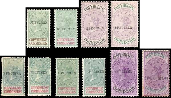 Copyhold & Co. Commission. Specimen group with 1881 watermark VR Script 2s6d, 10s, £1 and £5, handstamped Type GB9, fine but for hinge remainders; and an unlisted group, also handstamped Type GB9, in deeper colours, with 1s, 2s6d, 5s and 10s, all green and red watermarked Block VR, these with some faults and the first two with large adhesions, £1 purple and black Block VR, rubbing, and £5 deep purple and green watermark Scales, this latter overprinted Type GB 11, some foxing and with perfs at left clipped