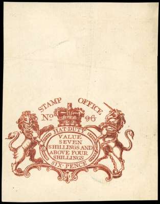 Hat Tax. 1803 6d chestnut (for hats VALUE SEVEN SHILLINGS AND ABOVE FOUR SHILLINGS) proof impression on thick laid paper of Plate 43 position 96, clear impression with margins good to huge, fine and attractive. Very rare. Booth Type 51-2B