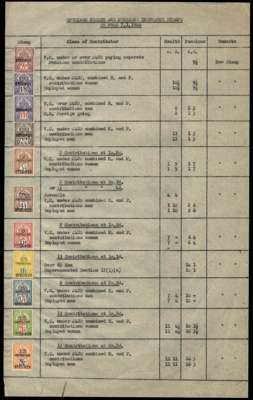 Health and Pensions Insurance. January 1946 new stamps affixed to a typed sheet, which gives a description of the classes of contributor liable to pay the stamp rate; eleven values from 9½d to 28/2d, each overprinted SPECIMEN. Includes seven for multiple contributions, one at 4/4d being for two at 2/2d or 13 at 4d (the latter for a juvenile). The 28/2d unlisted by Booth. Booth from 48 onwards