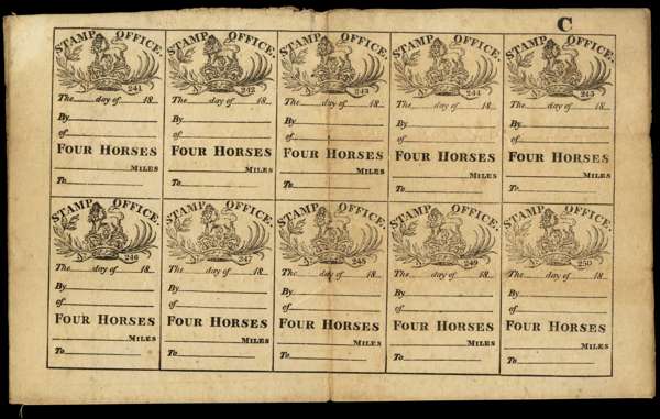 Hired Horse Duty. 1826 sheet of ten mileage tickets for four horses in black. Full margins, with the letter ‘C’ above the upper right stamp. Central vertical fold and some peripheral wear, unsurprising for an item about to celebrate its 200th birthday. Very scarce
