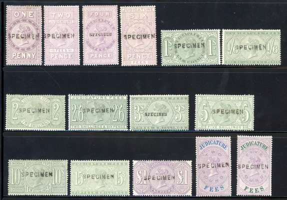 Judicature. 1881 set of fifteen overprinted SPECIMEN, occasional short perf and mixed mounting, as to be expected