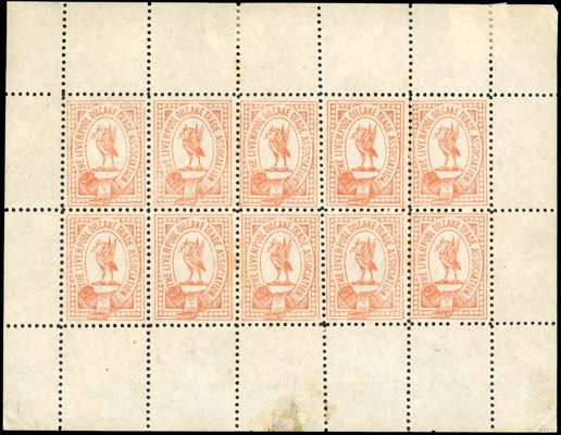 Liverpool Oil Cake Trade Association. Undenominated stamp in pale vermilion sheet of ten, perf 11 with margins all round, some faults (reinforced at top, splitting at left, some foxing on reverse) but an extremely rare sheet, the only one known to us
