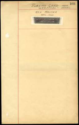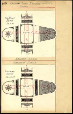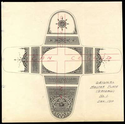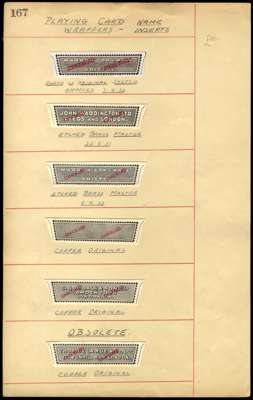 Playing Card Wrappers. Royal Mint Die Proofs from the volume presented to the Royal Mint engraver H.A. Richardson on his retirement. January 1913 “ORIGINAL MASTER PLATE (GOODALL)” large wrapper; 1931-2 seven proofs of inserts with names of card makers for large wrappers; 1923 proofs of working plates of wrappers for small (patience) cards for British makers and for imported cards; 1923 proofs of the panel inserts and duty shoulder for imported cards. Each item marked CANCELLED in red pen or handstamped thus in red. A very attractive group