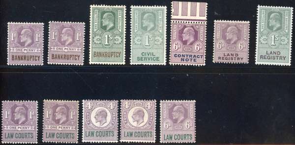 Revenues balance lot. 38 Specimens, almost all KEVII save one QV Companies Winding Up and two Isle of Ely; the others are KEVII Bankruptcy £20, Civil Service (4), Companies Winding Up (3), Contract Note (2), House of Lords (2), Isle of Man (4), Judicature Fees (5), Land Registry (4), Law Courts (6), Probate (10) and Public Records (3). A couple are duplicates, the condition is a little mixed but most are fine. Also issued KEVII Bankruptcy (3), Civil Service (1), Contract Note (1), Land Registry (2) and Law Courts (5)