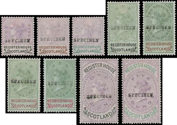 Scotland Register House. 1882 set (9) with 1d - 6d watermark Orb, 1s - 10s watermark Script VR, £1 and £5 watermark Orbs. Each handstamped SPECIMEN Type GB 9, good to fine o.g. Booth 34-42