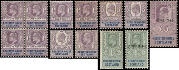 Register House. 1902 mint group with 1d block of four and two singles, 3d three single, 6d and 1s, all o.g., variable mounting; SPECIMEN Type GB 16 on 1s and £5, the latter no gum. Booth 52/59A