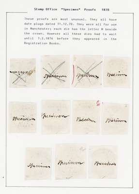 Stamp Office; Manchester embossed dies. 1870 £2 10s, £4 (2), £6, £7, £9, £15, £30, £50, £75 and £10, each with manuscript ‘Specimen’ in black, the first three with pencil crosses. Each has the letter ‘M’ for Manchester beside the Crown. All the dies have the same date plugs, 31.12.70, although they did not appear in the registration books until 3.2.76. Ex Champion, on his display sheet