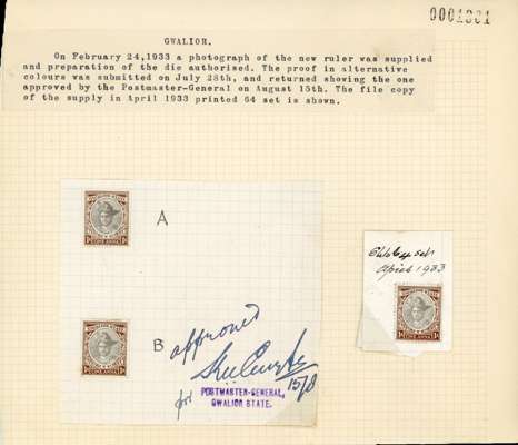 Revenue 1933 1a brown, imperforate colour trials (2) in different shades of grey and brown, affixed to archive piece with ‘Approved’ and signed in manuscript, then handstamps ‘POSTMASTER-GENERAL/ GWALIOR STATE’, offered with the file copy marked ‘64 set’ for sheet size and dated ‘April 1933’. A unique group illustrated in the De La Rue archive book. (Walton, 2014)