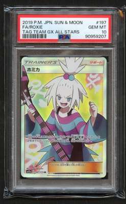 PSA 10 Roxie Full Art #197 Tag Team GX All Stars, a rare and highly collectible trainer card from the Tag Team GX All Stars set. Featuring Roxie in stunning full-art artwork, this card is a favorite among collectors and competitive players. Graded PSA 10, it is in gem mint condition, making it a valuable addition to any Pokémon TCG collection.