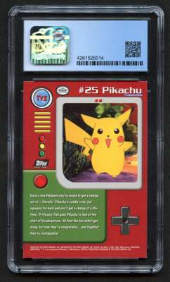 CGC 8.5 Pikachu Pokémon Topps 1999 Series 1 TV2 trading card, a sought-after collectible from the first Topps Pokémon release. This card features Pikachu, the beloved mascot of the franchise, in a design inspired by the original animated series. Part of the TV subset, it showcases a vibrant image of Pikachu along with key details from the show. The CGC 8.5 grade indicates excellent condition with minimal wear, making it a valuable addition for collectors looking to own a piece of Pokémon history. A nostalgic and eye-catching card from the late 90s era of Pokémon trading cards.