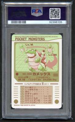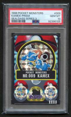 PSA 10 Kamex ‘Blastoise’ Prism Sealdass Series 3 1998 Pocket Monsters, a rare Japanese sticker featuring Blastoise in a dazzling prism foil design. Part of the vintage Sealdass Series 3 set, it is graded PSA 10 gem mint, showing no visible flaws. A highly collectible piece from the early era of Pokémon merchandise.