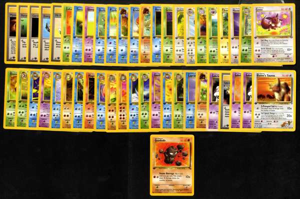 This lot contains 186 1st Edition cards from a range of vintage sets such as Jungle, Fossil, Team Rocket, Gym Heroes, Gym Challenge, Neo Genesis, Neo Discovery, Neo Revelation, Neo Destiny. the condition ranges from HP to NM, with the majority of cards being in LP-NM conditions.