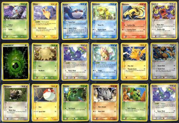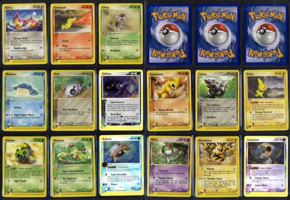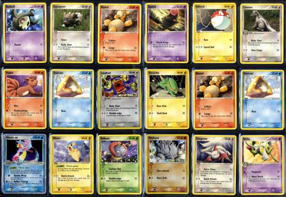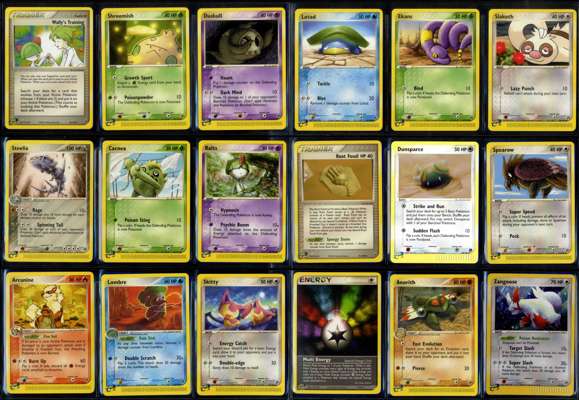 Milotic ex (EX Emerald)Zangoose (EX Sandstorm)Reverse holos such as Sableye, Kabuto, Dunsparce and Lunatone from EX SandstormHolo Grass Energy and Reverse holos such as Loudred, Rhyhorn and Dodrio from EX Emerald.