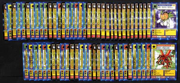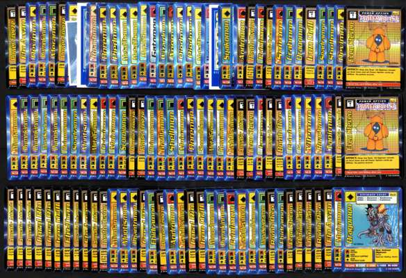 This lot contains cards from the 1999 Digimon Series 1 set. All cards are in HP-LP conditions. In addition to the 142 bulk cards, there are also 11 Holo cards.