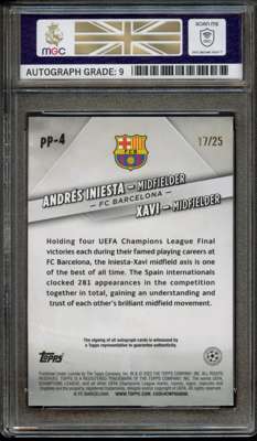 2023 Topps UCC Flagship Iniesta/Xavi Dual Autograph, numbered 17/25 and graded a 9 by MGC.
