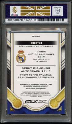 2025 Topps Palatial RM Rodrygo Red Diamond Auto, numbered 1/5 and graded a 10 by MGC.