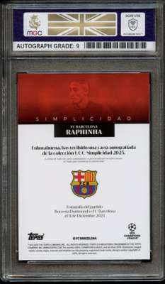 2025 Topps Simplicidad Raphinha Red Autograph, numbered 06/10 and graded a 9 by MGC.