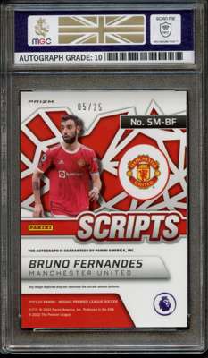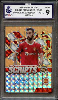 2022 Panini Mosaic Bruno Fernandes Orange Fluorescent Auto, numbered 05/25 and graded a 9 by MGC.