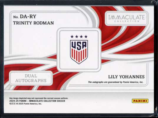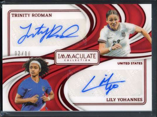 A Panini Immaculate Trinity Rodman / Lily Yohannes Dual Autograph card from 2024-2025 in Near Mint condition (No. DA-RY). Numbered 2/10
