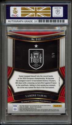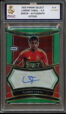 2025 Panini Select Lamine Yamal Green Autograph, numbered 4/5 and graded Authentic by MGC.