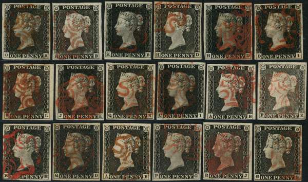 1840 1d black unplated range of fifteen, all four margins, cancelled with red MCs, fine used (18)
