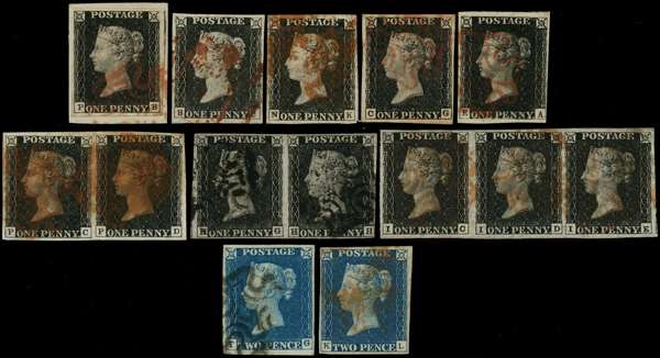 1840 1d black selection of five four-margin singles, two horizontal pairs and a strip of 3 (IC to IE) with split plus 2d blue two four-margin singles. A useful group, good to fine used. (14) SG 1,5