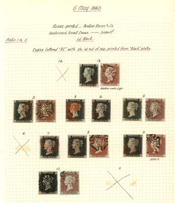 1840-41 Plate range of 1d blacks all lettered AC with matched pairs for Plates 1b (with 1d red-brown struck by Wotton under Edge distinctive MC in black) 2, 5, 8, 9, & 10. Up to four margins, mostly neat MC's in either red or black, some imperfections, still a largely fine group. SG 2-7