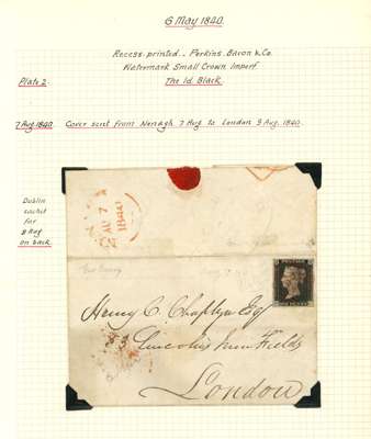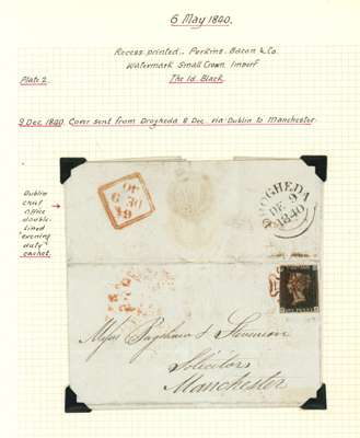 1840 plated and unplated range of 1d blacks including, eight used singles (upto four margins) all cancelled by black MC with some noted guide lines, and four entire letters franked by 1d blacks, with entire from Nenagh Ireland to London, Drogheda to Manchester, with noted postal markings, generally fine condition.